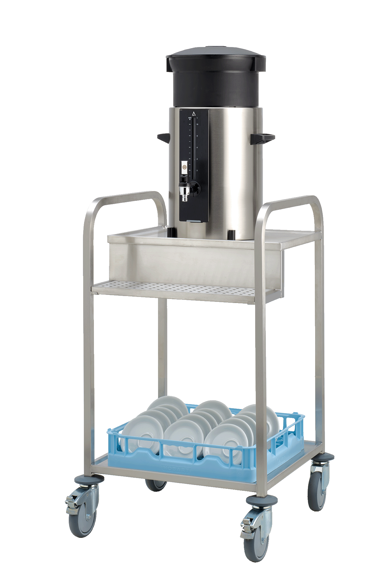 Den här öppna serveringsvagnen är idealisk för transport av kaffe- och teförpackningar. Vagnen är som standard utrustad med fyra länkhjul, varav två med broms, och har grå stötfångarrullar. Topplattan har en löstagbar droppbricka och tre centreringsaxlar. På bottenplattan finns plats för t.ex. termosar eller sköljkorgar. Centrerande axlar förhindrar att behållaren glider under transport. Tyngdpunkten ligger alltid säkert ovanför hjulbasen.